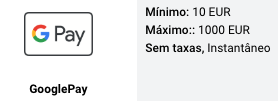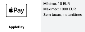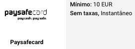 | Outros depósitos | Apple Pay, Google Pay, Paysafecard, cartão e criptomoedas |