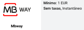 Sim. O MBWay está disponível para depósito em Portugal, com mínimo de 1€, sem taxas e de forma instantânea.